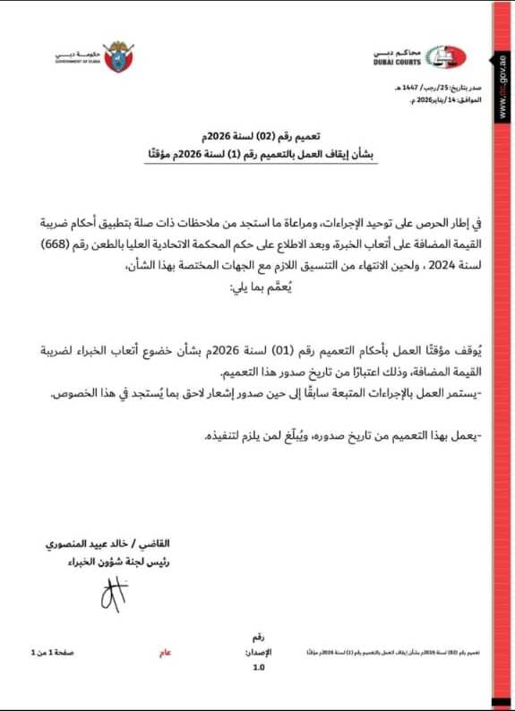 Dubai Courts issued Circular No. (02) of 2026, which temporarily suspends Circular No. (01) of 2026 concerning the application of Value Added Tax (VAT) on expert fees.